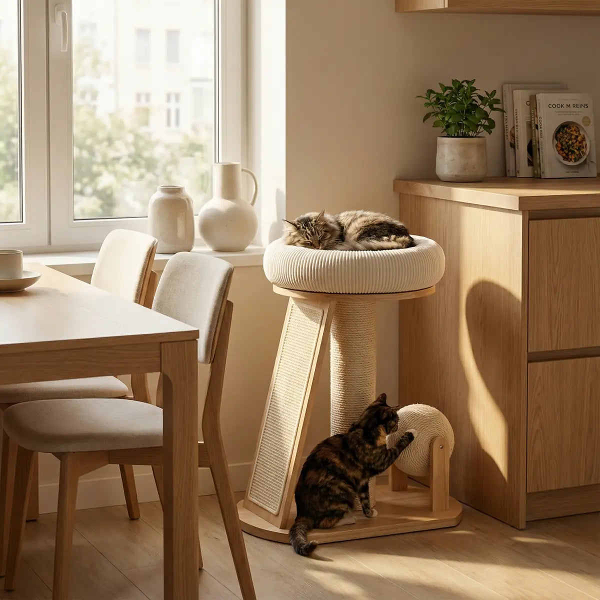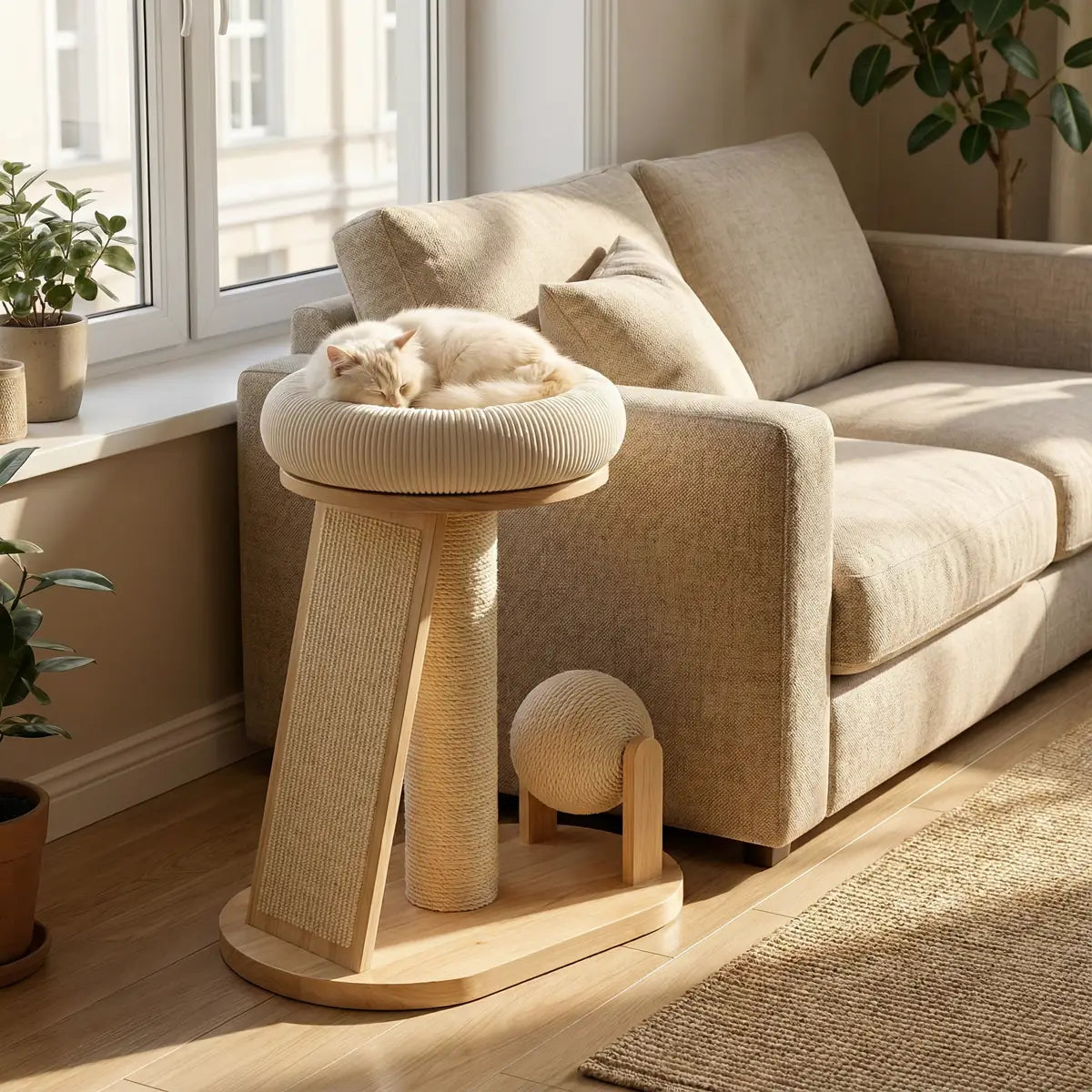 The raised cushioned bed gives your cat a soft and secure place to rest, while the natural sisal scratching ramp supports healthy scratching behavior and helps protect your furniture. The integrated play ball provides gentle stimulation and daily enrichment.